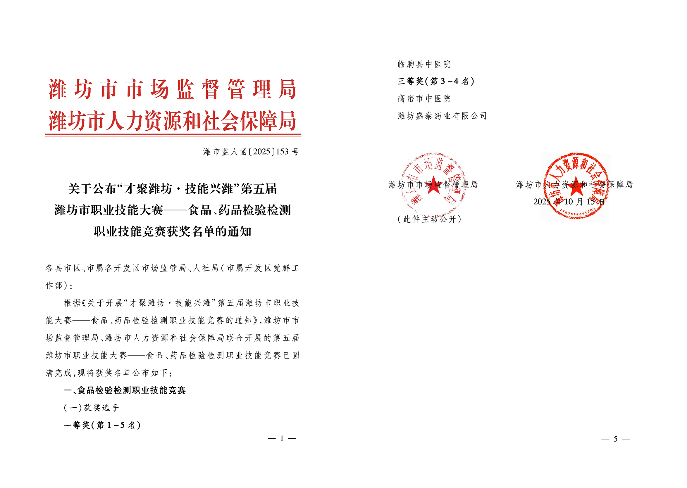Recently, the Weifang Market Supervision Administration and the Weifang Human Resources and Social Security Bureau jointly issued a notice on the announcement of the winners of the "Talent Gathering in Weifang, Skill Revitalize Weifang" 5th Weifang Vocational Skills Competition - Food and Drug Inspection and Testing Skills Contest.
